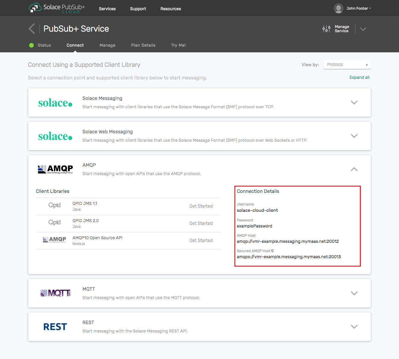 For establishing the JMS connection you need to know the Solace messaging host name with the AMQP service port number, the client username and optional password.