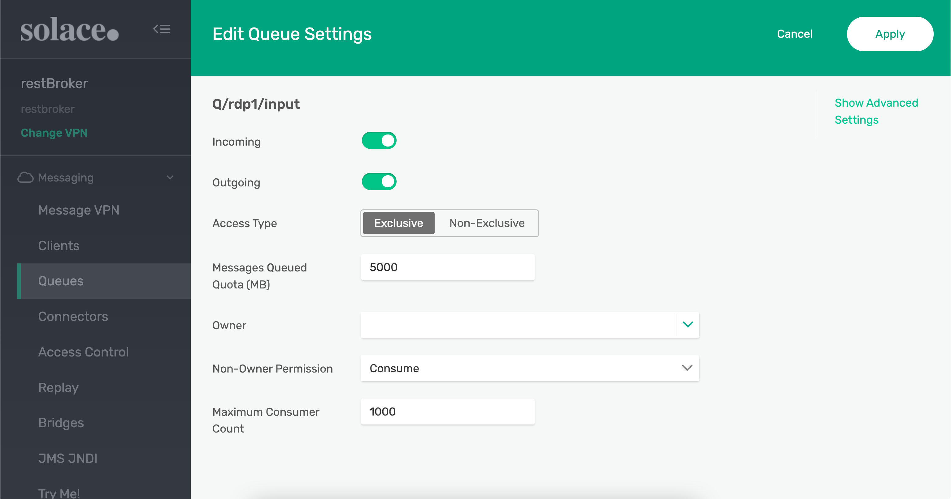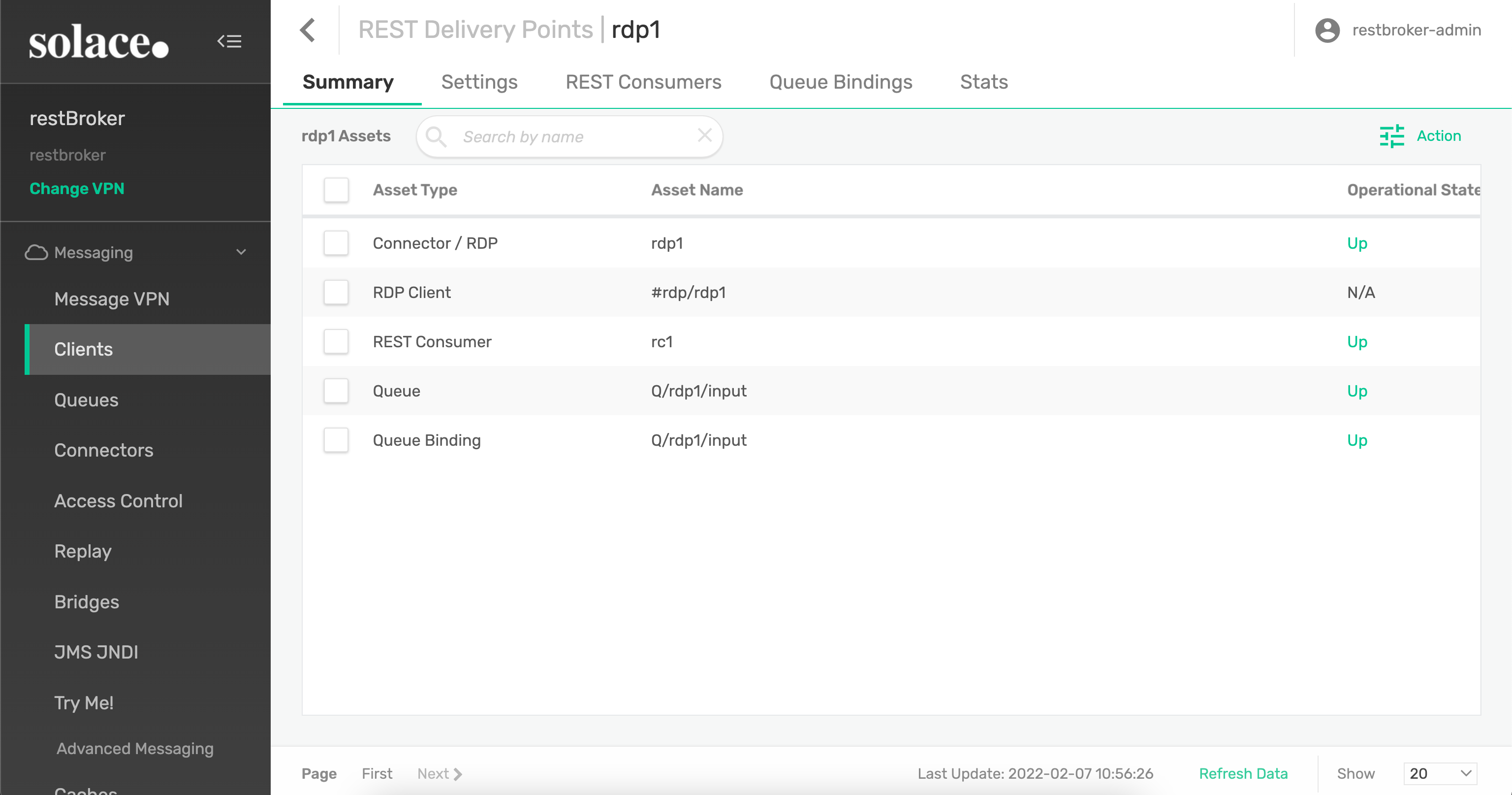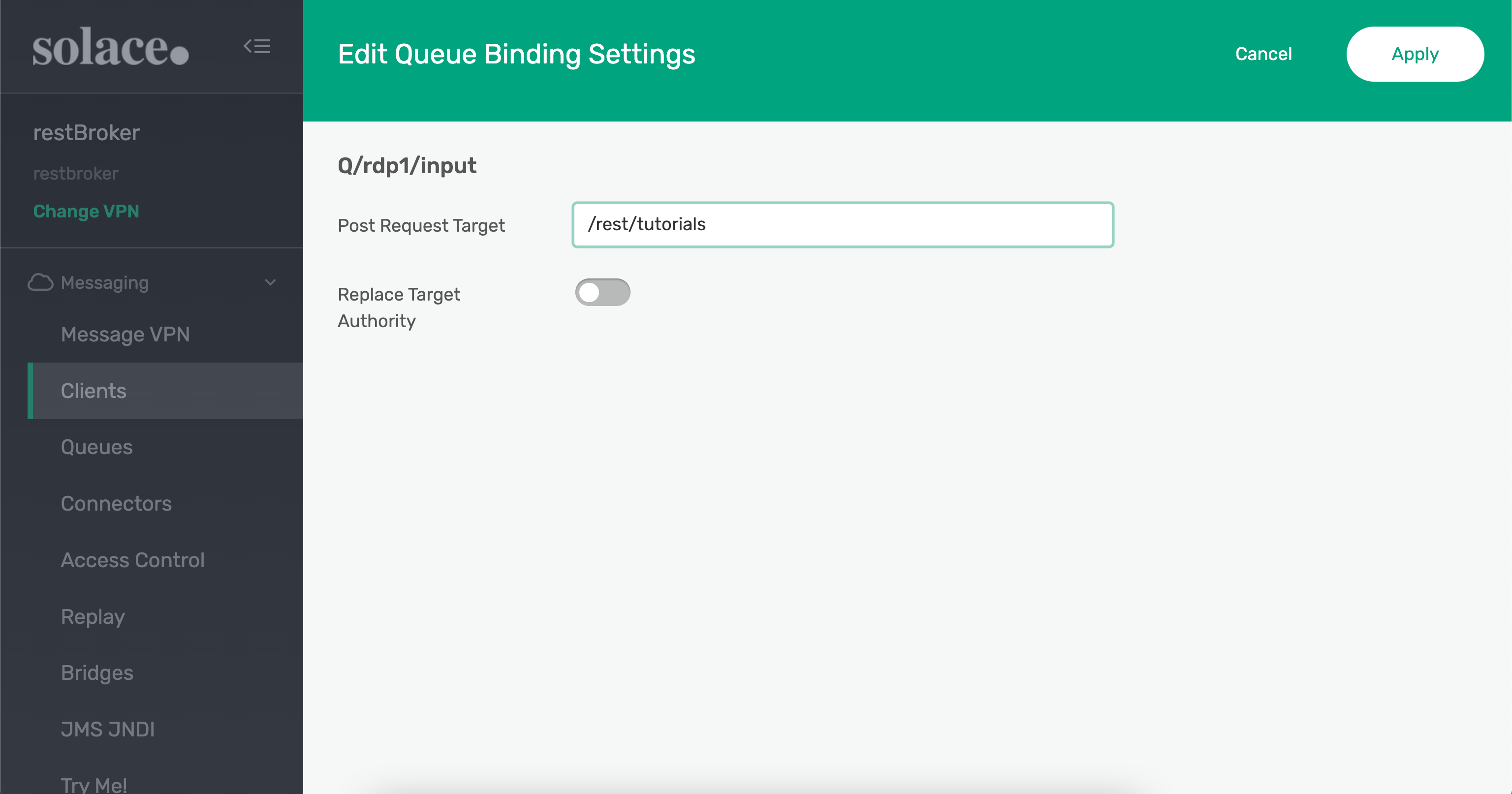 In order to receive REST messages from Solace Message VPN, you must configure a Guaranteed messaging queue and a REST delivery point. The queue is used to attract messages to the consumer application. The REST delivery point is the Solace message router component that delivers the messages from the queue to the consumer application asynchronously through HTTP POST requests. This is explained in detail in the REST Messaging Concepts. This tutorial will walk you through the required Solace Message VPN configuration required to create a queue and REST delivery point to connect to your REST consumer application.